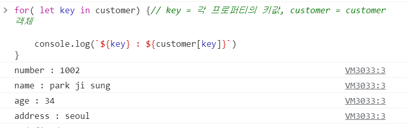 for( let key in customer) { //key = 각 프로퍼티의 키값, customer = customer 객체